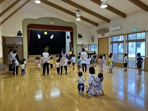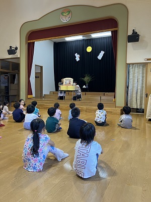 今日はお月見会があり、「つき」の歌を歌ったり紙芝居を見たりしました。お月見は何でするのかや、昔のお月見団子は里芋だった話など、紙芝居を通して学びました。