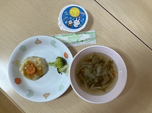 給食は、「手作りお月見つくね蒸し」「十五夜デザート」でした!お月見つくねを見て「これが月なんじゃない?」「人参がうさぎになってる!」デザートを食べて「すごくおいしかった!」と大喜びのこどもたちでした。