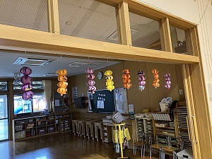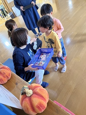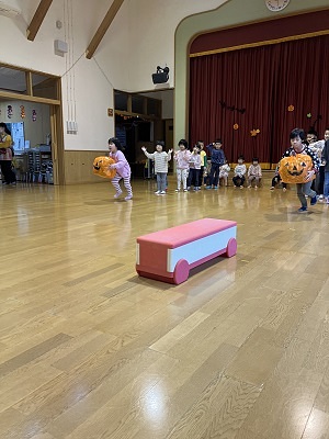今日はハロウィンの集いがありました。全クラスの子どもたちが参加し、ホールでゲームをして楽しみました。腕には1人1つ、ハロウィンの光るブレスレットをし、嬉しそうにお友だちや職員に見せていました。また、今日までに各クラスでハロウィンにちなんだ装飾なども制作し、保育室などに飾りました。その他、以上児クラスは合言葉を言ってプレゼントをもらうというゲームもしました🎃