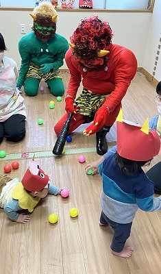 毎年恒例の豆まきを行いました。「がんばるぞ!」「えいえい!おー!」と張り切っていた子も、いざ鬼が登場す...